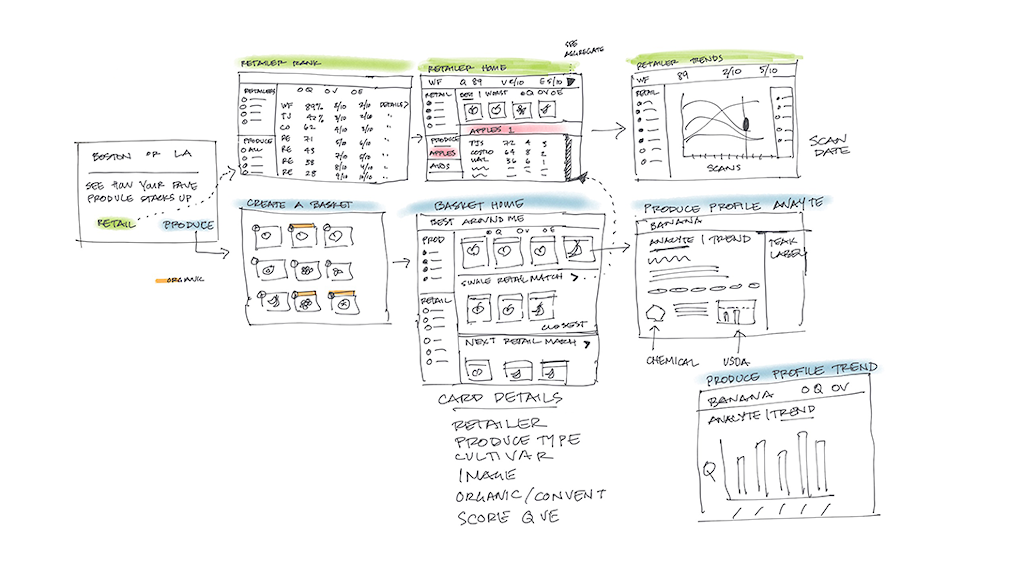 Next, we developed a data model to package TeakOrigin’s metrics for both retailers and consumers. Tapping our user research, we created a visual and verbal design language to translate food science analytics into data points users care about, including the nutritional quality and cost of produce.